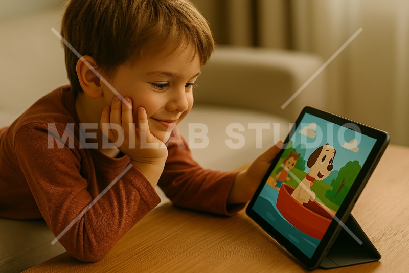 子どもがタブレット端末を活用してアニメを楽しんでいる様子。楽しそうで温かい雰囲気。