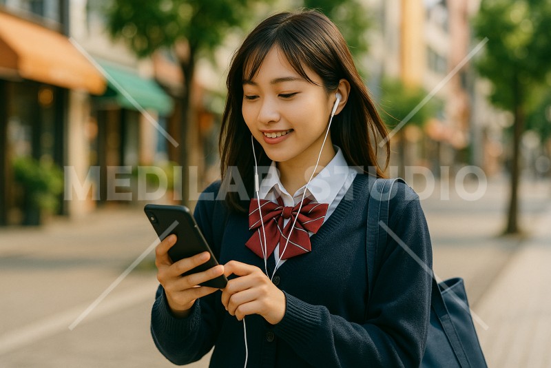 女子高生がスマホを活用して音楽を聴きながら通学する様子。明るい朝の雰囲気。