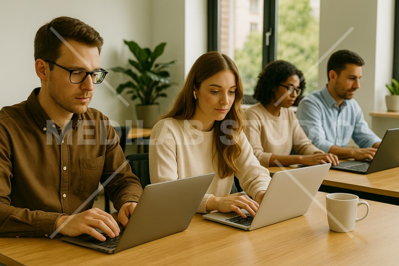 ノートパソコンを活用してビジネスパーソンが作業している様子。開放的なカフェテリアをイメージ。