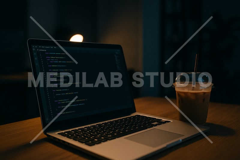 深夜にカフェラテを飲みつつ作業を進めるプログラマーのイメージ。甘いカフェラテでもうひと頑張りのイメージ。