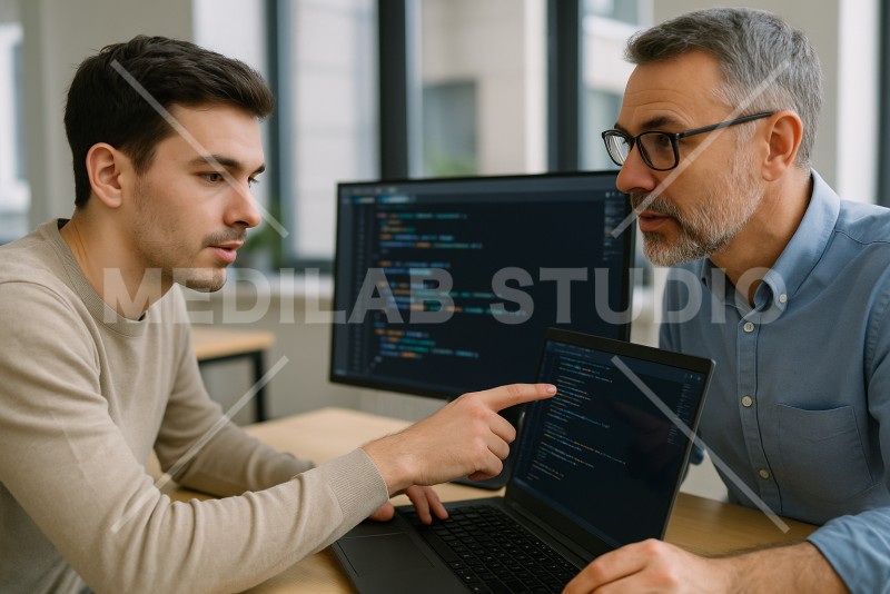 開発者が上司とプログラムについて相談している様子。採用サイト向け。