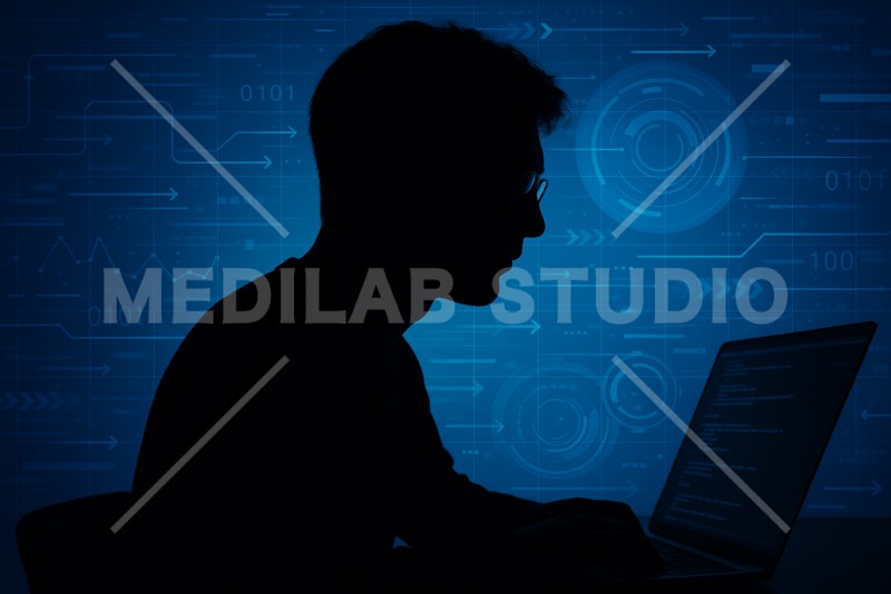 エンジニアが脳内でプログラムを構成しているイメージ。シルエットがスタイリッシュな印象に。