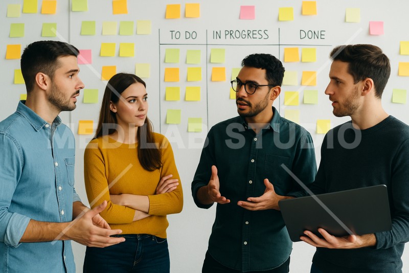エンジニアが開発について意見を交わしている様子。ホワイトボードとふせんを活用してオープンな議論をイメージ。