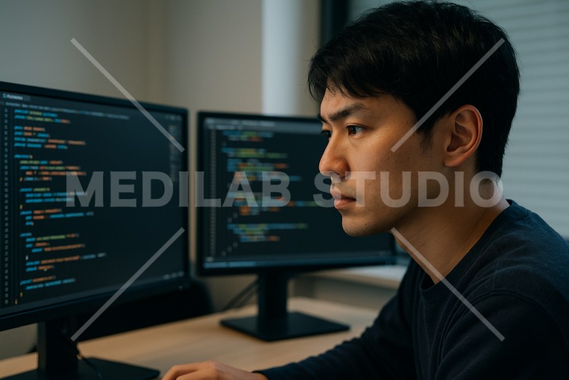 複数のモニターを活用してエンジニアが真剣にコーディングする様子。モニターにはコードが映っている。