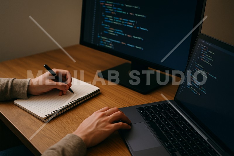 プログラミングをしながら手元でメモを取る人の様子。開発中の問題解決や勉強の様子を表現。