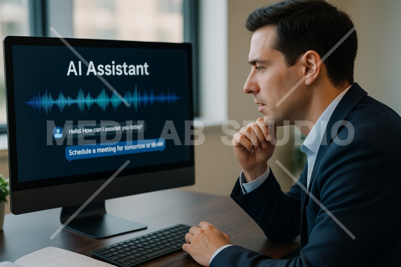 AIアシスタントを取り入れている企業で、ビジネスパーソンが相談をしている様子。