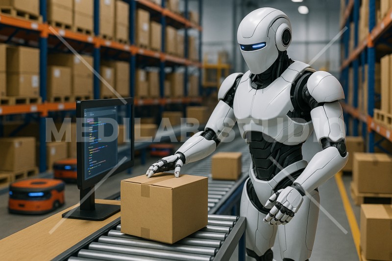 AIが搭載された人型ロボットが配送される荷物の仕分けを行う様子。未来のロジスティックスをイメージ。