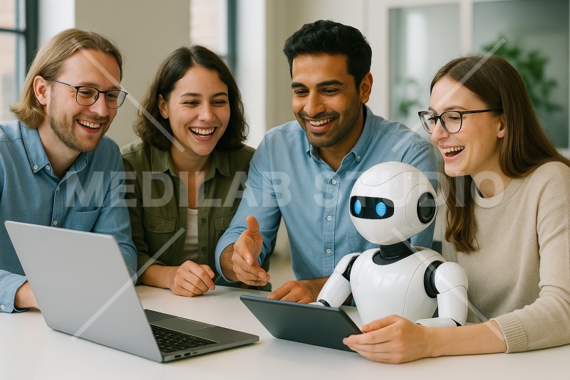 AI開発を担当しているチームが、開発中のロボットについて会話している様子。AIロボット開発のイメージ。