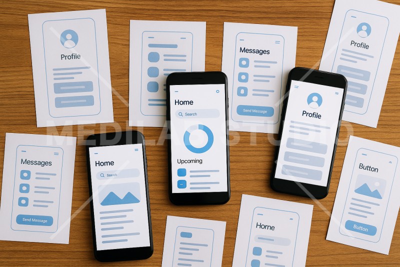 アプリのUIをメモした紙と実際の端末での操作画面。想像を形にしていく様子をイメージ。