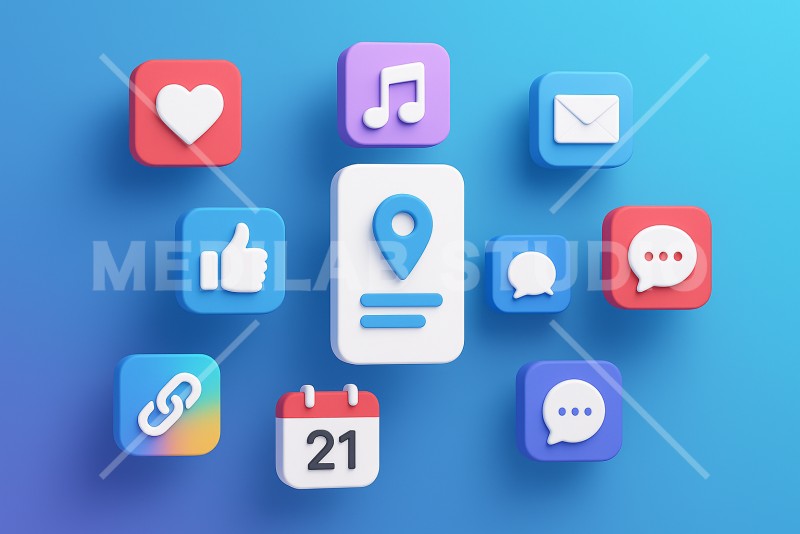 アプリのアイコンが浮かぶ様子。生活に欠かせないさまざまなアプリのコラボレーションイメージ。
