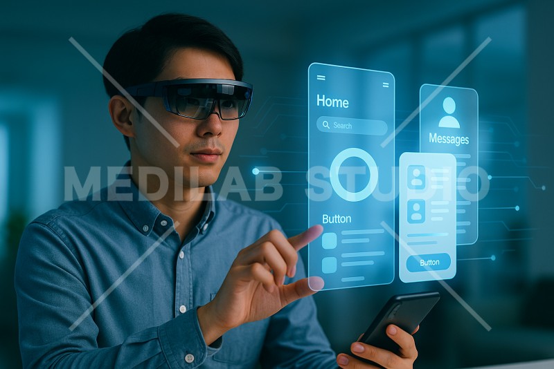 未来的なアプリUI開発シーン。空中に浮かぶUIを実際に操作してエンジニアが開発を進める様子。