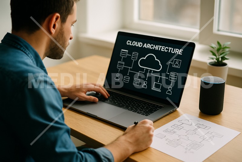 ネットワーク上のクラウドを設計するエンジニア。使用者の行動を予測しながら設計する様子。