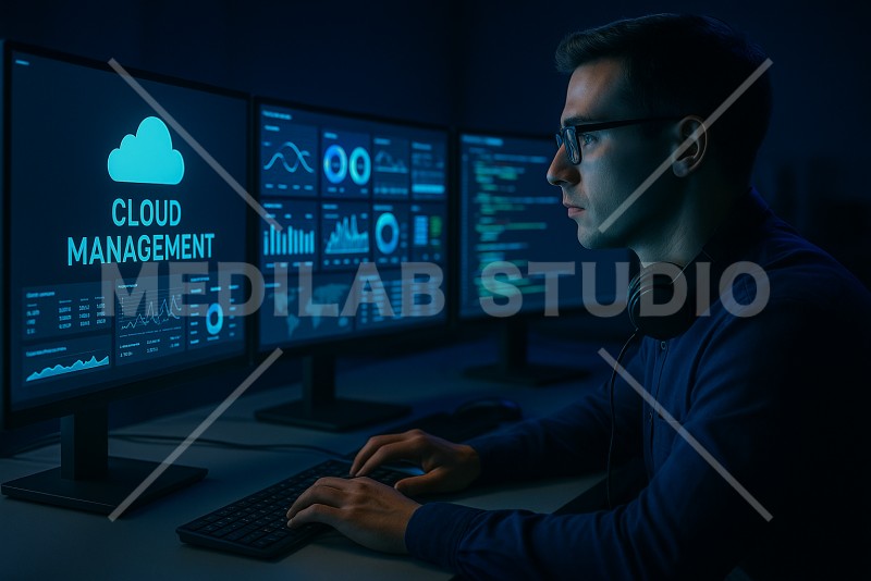 クラウドの管理をするエンジニアの作業風景。暗い中でモニターの表示が光る構図。