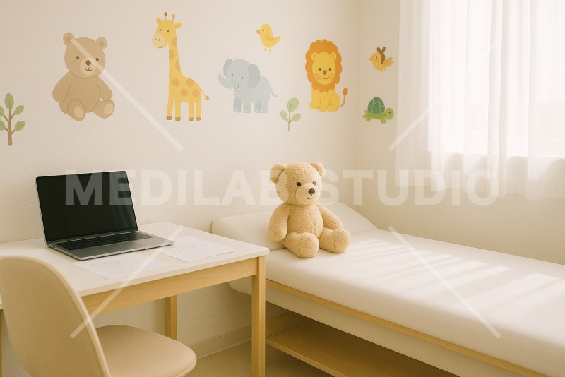 子どもが緊張しないように配慮された小児科の診察室。ぬいぐるみや壁面飾りがかわいらしい雰囲気。
