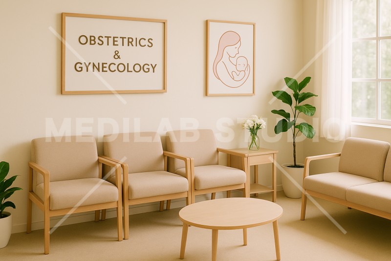 産婦人科クリニックの待合室。リラックスできそうな優しい雰囲気の空間。