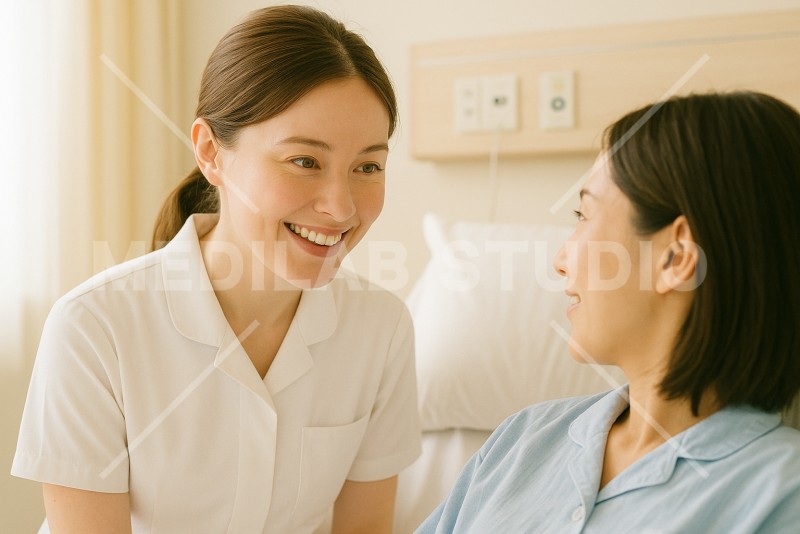 病棟で患者と会話している看護師。安心感があるはつらつとした笑顔。