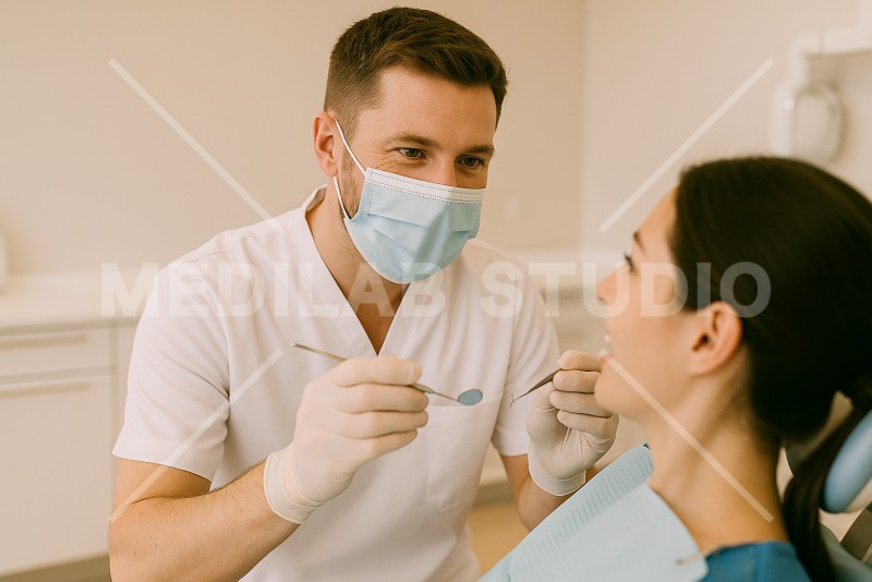 虫歯の患者を診察中の外国人歯科医