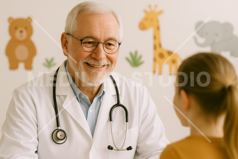 笑顔を浮かべて診察中の高齢外国人小児科医