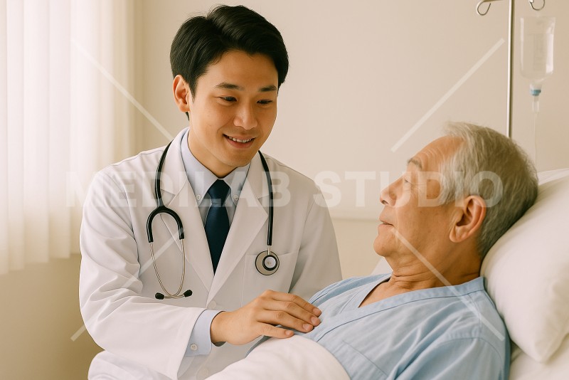 入院患者の診察をしている日本人の若手医師。朝の回診のイメージ。