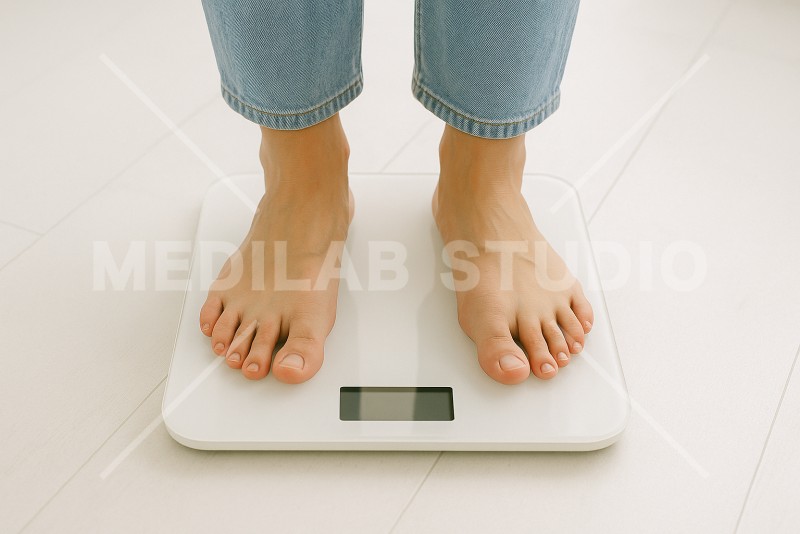 体重計に乗って体重を計測する人の足元。健康管理のための計測をイメージ。