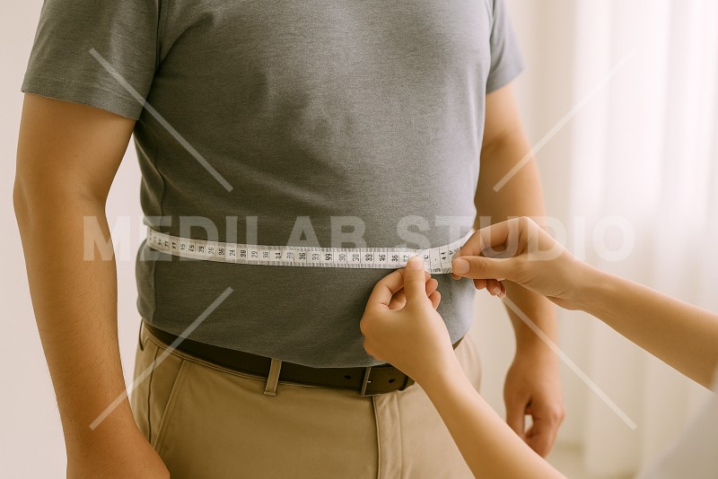 健康診断で腹囲を計測されている人の様子。おなかの周りを測定中。