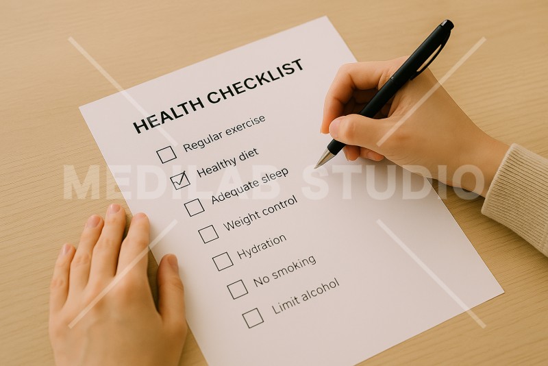 健康に関するチェックリストにチェックをしている人の手元。健康のセルフチェックをイメージ。