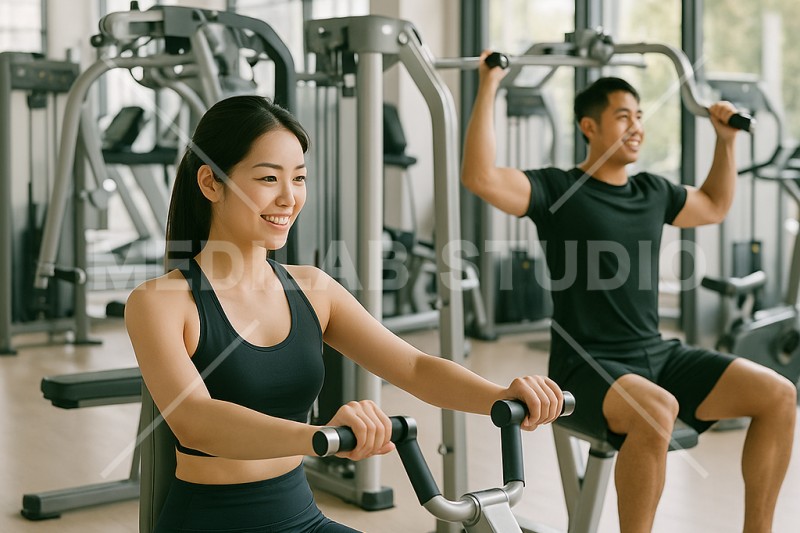 スポーツジムでマシントレーニングを楽しんでいる男女。元気で健康的な様子をイメージ。