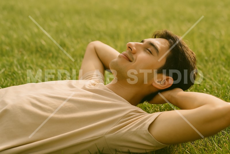 芝生に寝転んでリラックスする人。緑に囲まれてメンタルが回復するイメージ。
