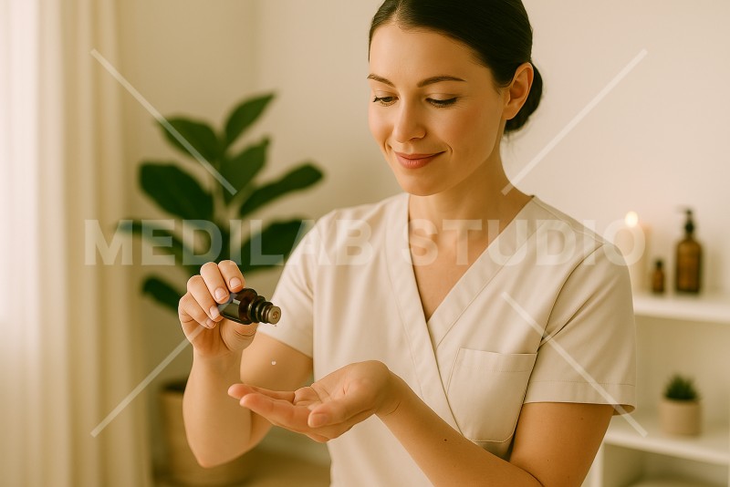 セラピストの女性がリラックス効果のあるアロマオイルを手に取る様子。