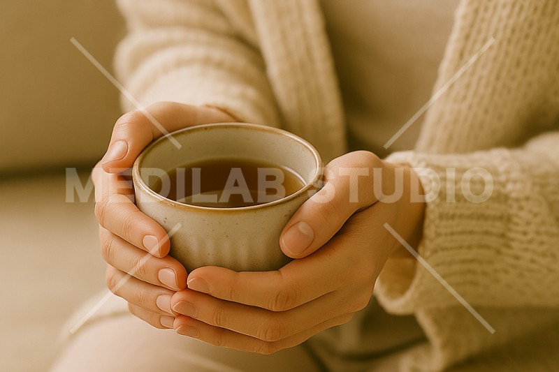 心が落ち着く温かいお茶。女性が手に持ってリラックスしようとしている様子。