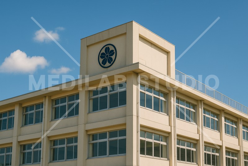 すっきりとした青空の下に映える校舎。小学校か中学校のイメージ。