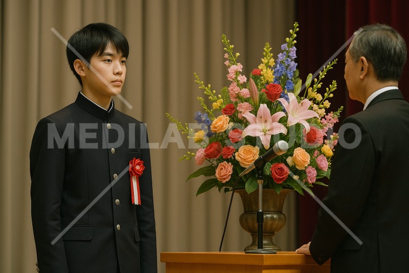 中学校での卒業証書授与の雰囲気。学ランの男の子が証書を受け取る前の様子。