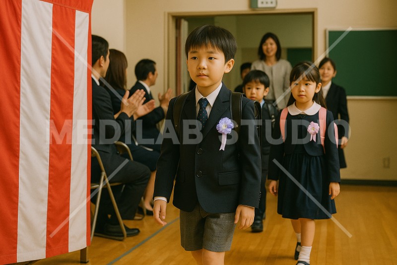 小学校の入学式で子どもたちが入場する様子。緊張した表情。