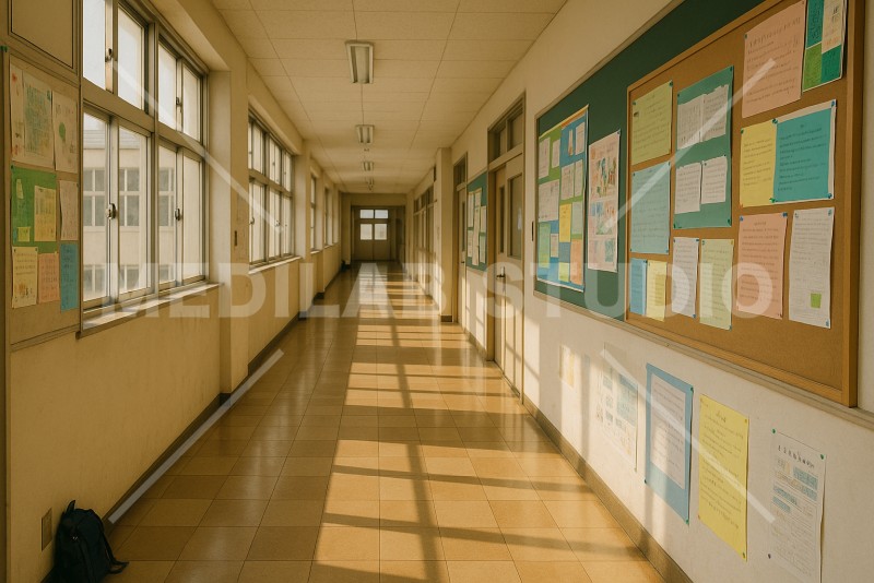 数多くの掲示物が貼られている学校の廊下。小学校・中学校をイメージ。