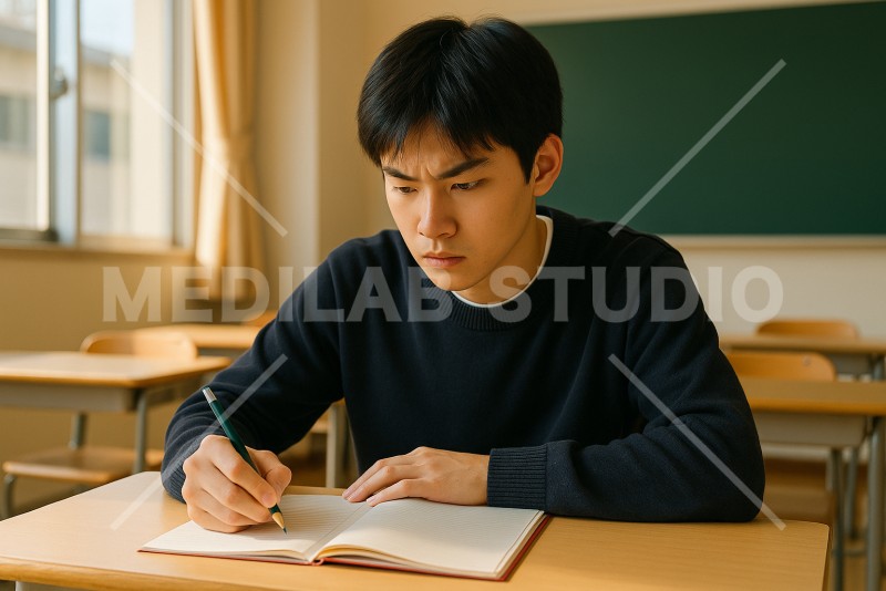 真剣な表情で学習している高校生男子。試験前などの自習時間をイメージ。
