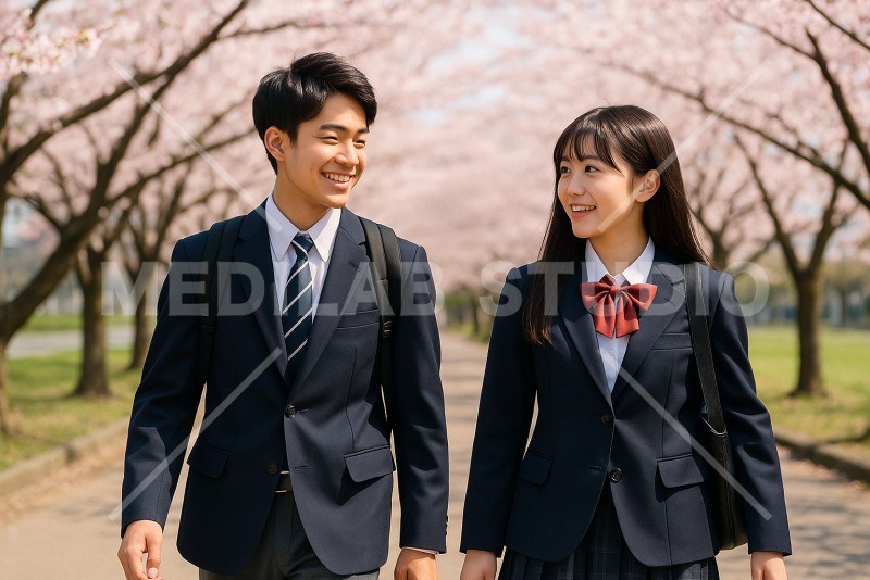 春の満開の桜並木。高校生の男女が和やかに話しながら通学している様子。