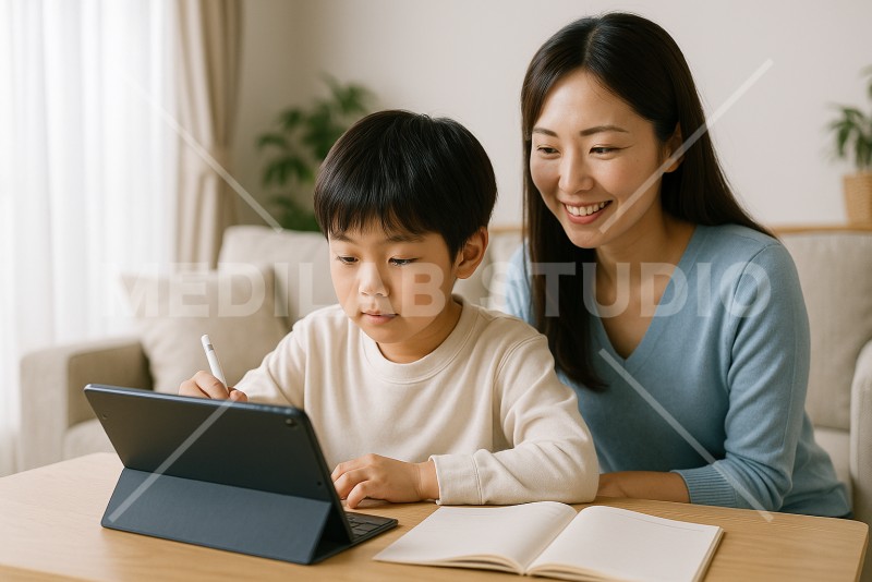 オンライン教材を使って学習する低学年の男の子。母親が近くでサポートしている。
