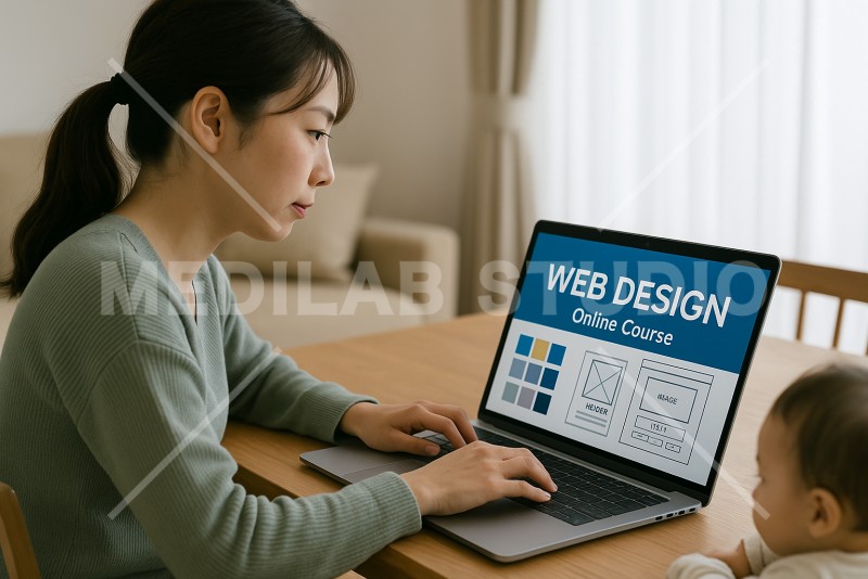 育児中の女性がオンラインのウェブデザイン講座を受講する様子
