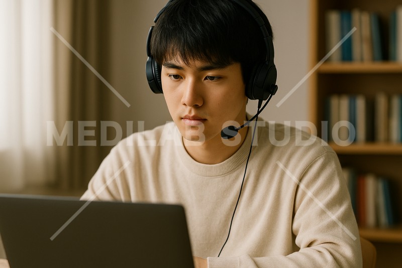 自宅でオンライン学習をしている男子大学生。リラックスした服装。ノートパソコンとマイク付きヘッドホンを使用。