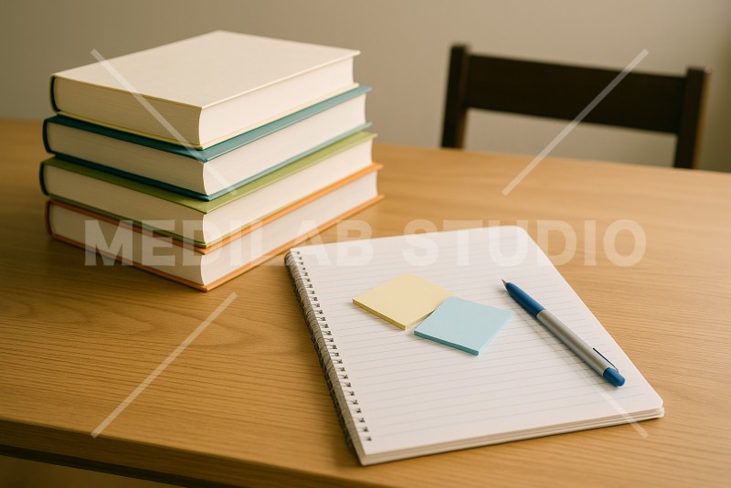 書籍を活用した学習イメージ。書籍・ノート・ふせん・ペンが机上に並ぶ様子。