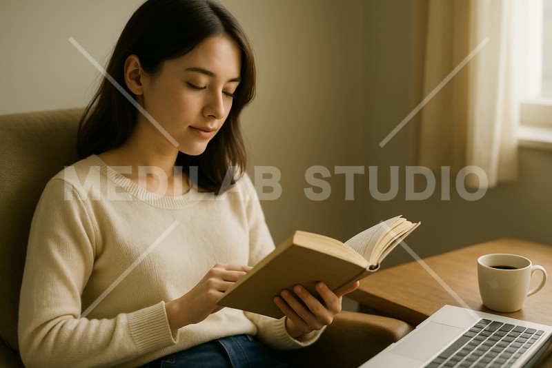 自宅で静かに読書をする女性。ノートパソコンが置いてあり仕事の合間の息抜きをイメージ