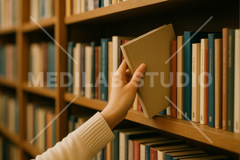 気になる本を手に取る人の手元構図。これから始まる読書時間をイメージ。