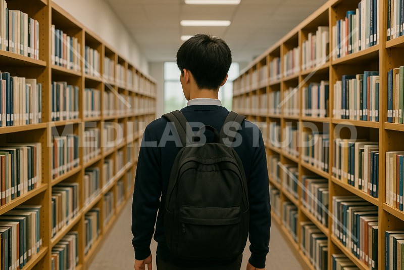 図書館で本を探す人の後ろ姿。大きな本棚の間を移動している様子。