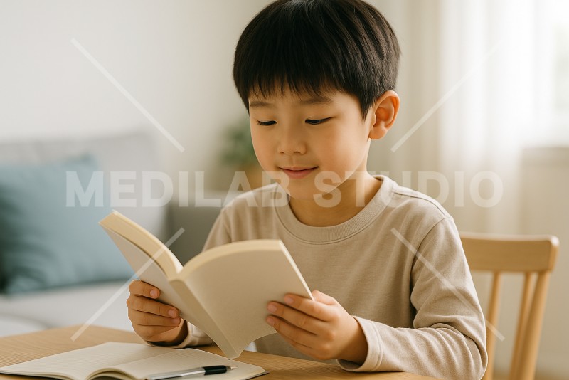 自宅で読書をしている男の子。笑顔を浮かべて楽しいストーリーを読んでいる様子。