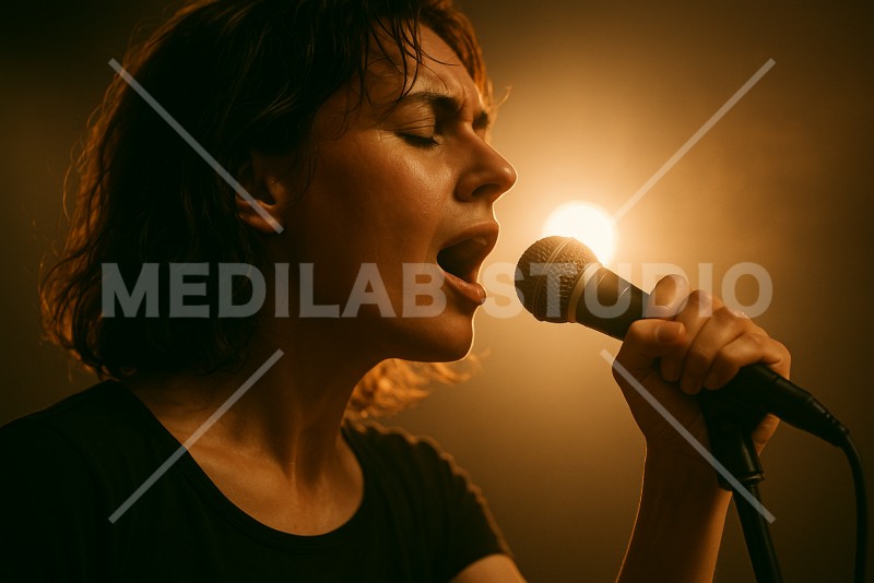 ライブ会場で歌うボーカリスト。バンドメンバーの1人を想定。熱気とステージのライトを表現。