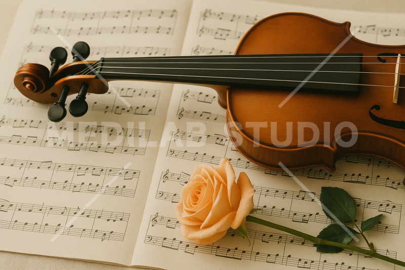 楽譜とバラの花と一緒に置かれたバイオリン。優雅なイメージ。