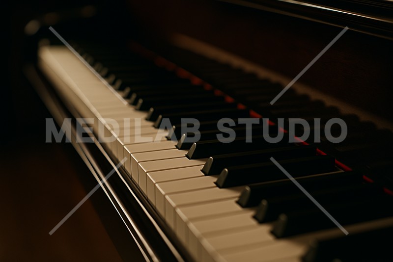 少し暗い場所に置かれたピアノをイメージ。静かな空間で鍵盤をアップに。