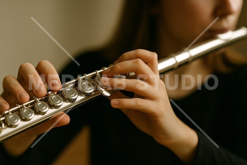 女性のフルート奏者の手元写真。まさに演奏中の雰囲気。