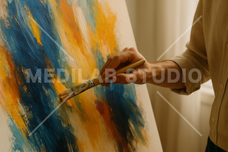 絵画を楽しんでいる人の手元アップ。黄色や青を使って抽象的な表現を楽しんでいる様子。