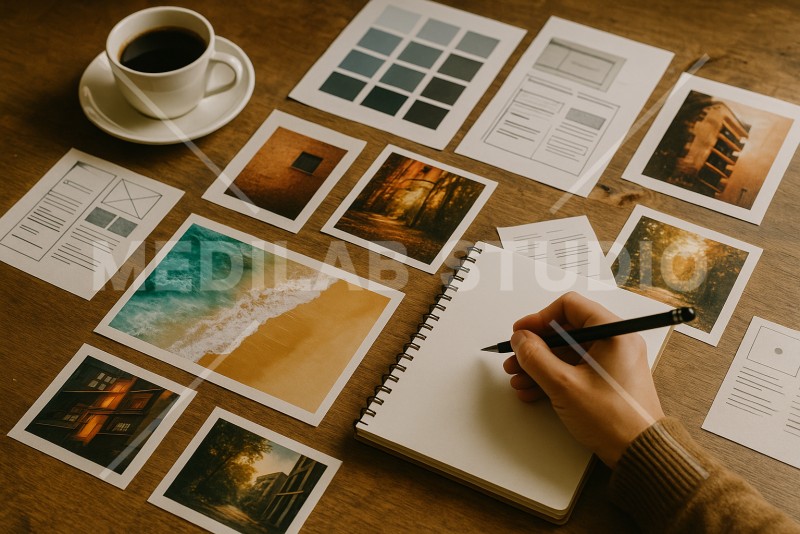 アーティストが写真からアイデアを得てメモを取っているところ。創作の風景。